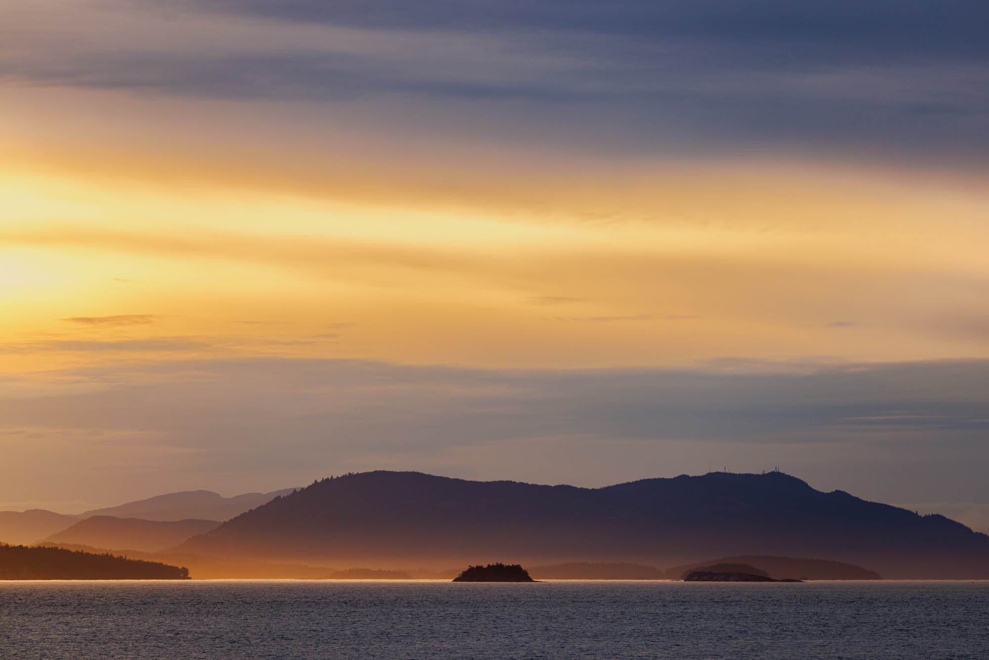 At Haro Strait, Esterre’s San Juan Island home — where the sun slips behind the island
